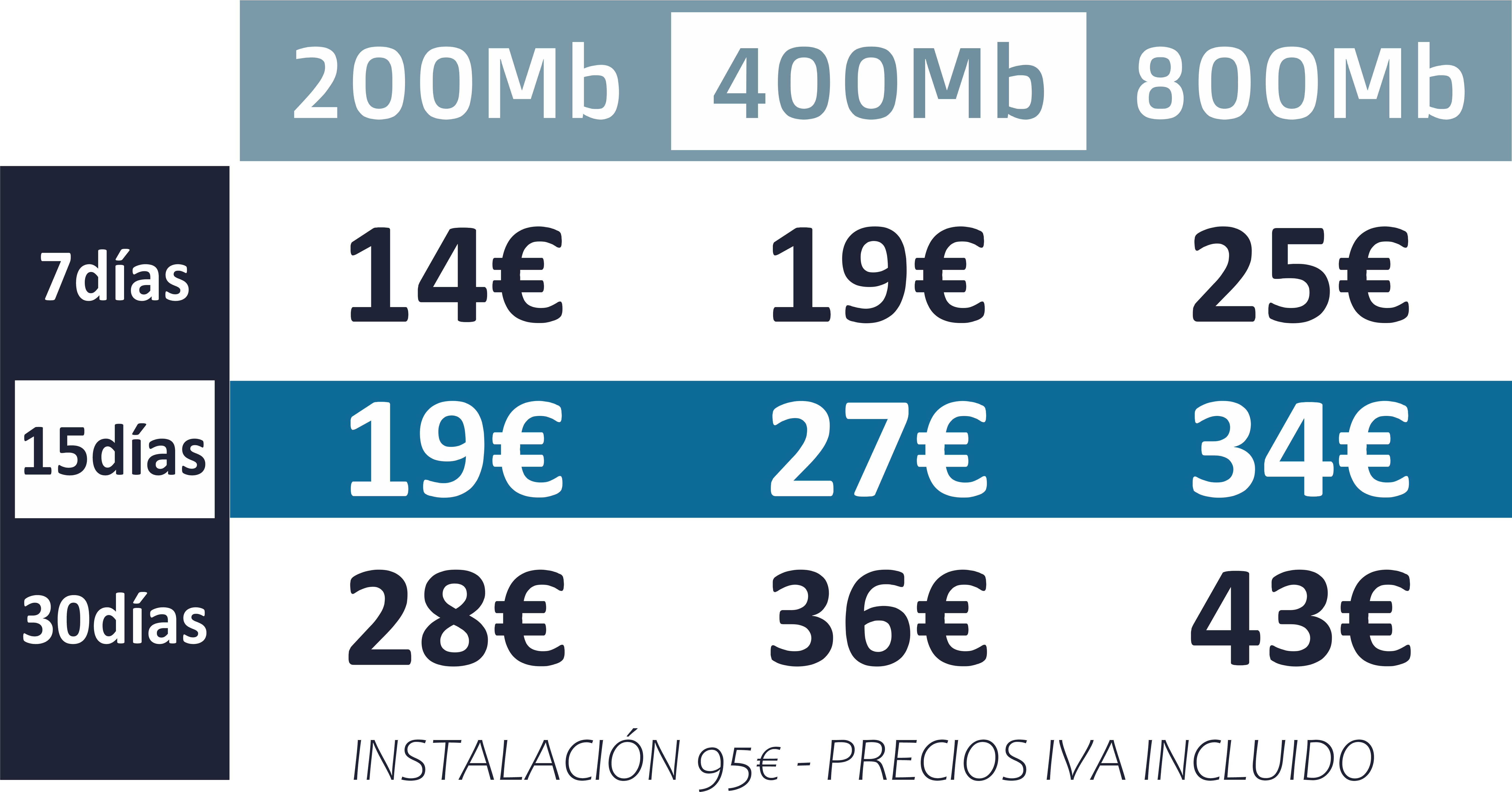 Con nuestra FIBRA TEMPORAL , es muy fácil, solo tienes que pagar la instalación y a partir de ahí tu eliges tiempo y velocidad que quieres contratar (precios detallados a continuación), puedes contratar por semanas, quincenas o meses, no volverás a pagar hasta que vuelvas y necesites activar el servicio de nuevo.